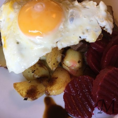 Med en halv oksecuvette tilbage fra i går, var det oplagt at lave en omgang luksusbiksemad i dag. Så kødet blev skåret i tern og stegt med nye, danske kartofler og dertil spejlæg.