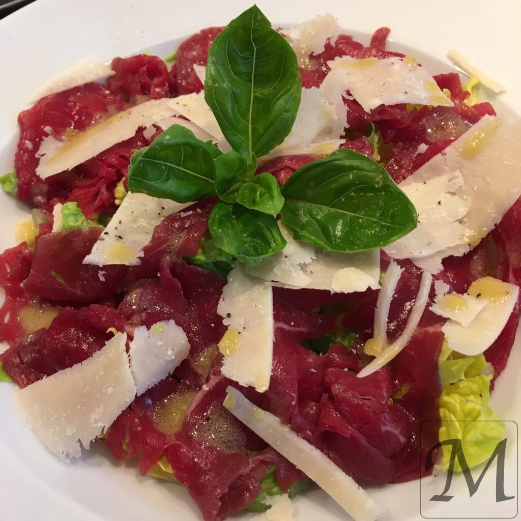 Ældstearveingen fik lov at vælge dagens menu, da mellemsten ikke var hjemme. Og er der een ting, han elsker, er det carpaccio! Så det skulle det selvfølgelig være. Yngsten fik tortellini med ost og skinke, for hun er kræsen og det er et sikkert valg. Så vi tre andre sad og smovsede i hver vores tallerken carpaccio på salatbund, men friskhøvlet parmesan og god dressing.