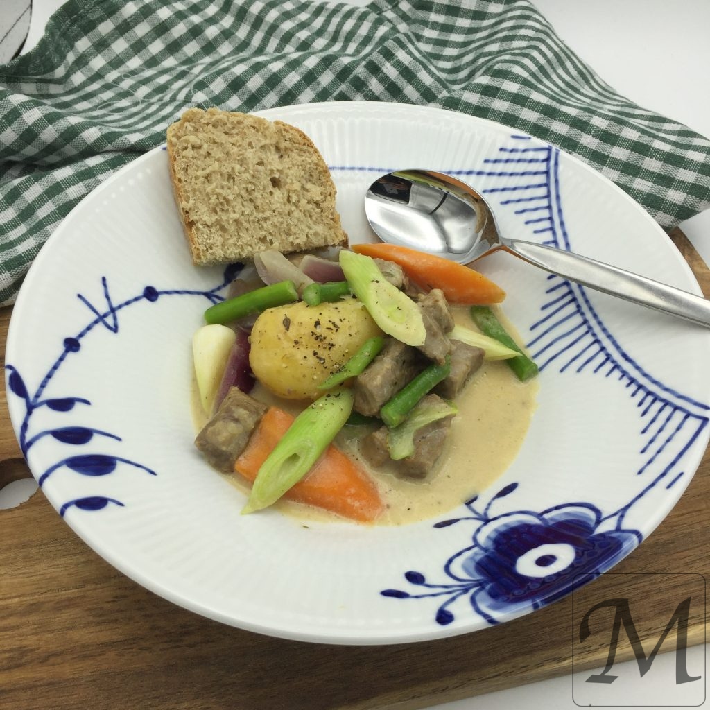 Jeg brugte en kalveculotte, som vi fik på tilbud, og skar den fri for sener og fedtkant og så i tern. Yderligere var der apsarges, forårsløg, rødløg og hele kartofler i og så blev den jævnet med madlavningsfløde o gserveret med et godt brød bagt på Ølandshvede.